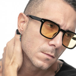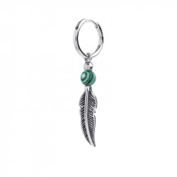 Descrizione: orecchino mono a cerchio in acciaio con pendente a sfera a cui è collegata una piuma con black oil opaco