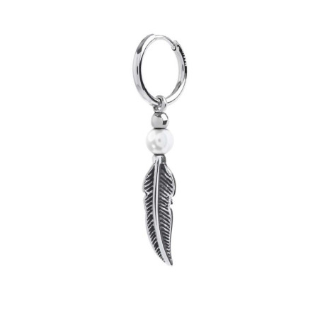 Descrizione: orecchino mono a cerchio in acciaio con pendente a sfera a cui è collegata una piuma con black oil opaco