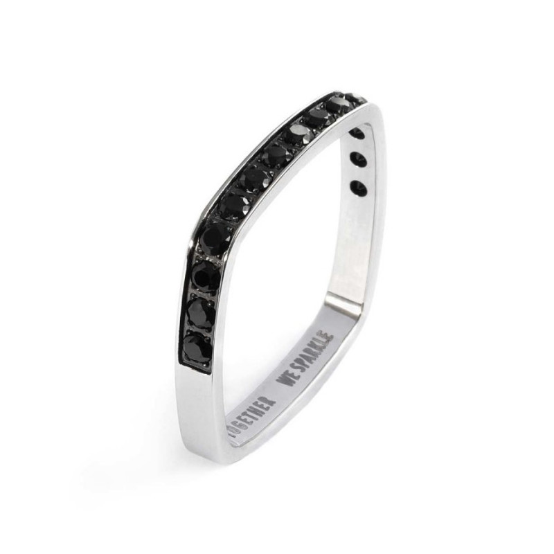 Descrizione: anello fedina squadrata in acciaio con cubic zirconia di diametro 2 mm. Nella parte interna è incisa la scritta "TOGETHER WE SPARKLE", logo Marlù e taglia presenti sui lati interni.