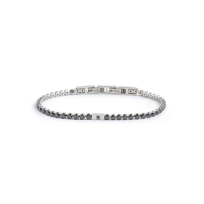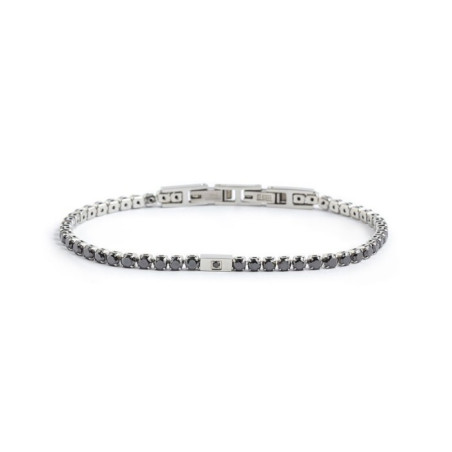Descrizione: bracciale con catena tennis in acciaio con cubic zirconia di diametro 3 mm. Al centro una placca in acciaio con cubic zirconia al centro.