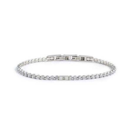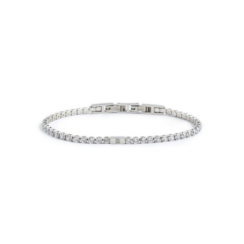 Descrizione: bracciale con catena tennis in acciaio con cubic zirconia di diametro 3 mm. Al centro una placca in acciaio con cubic zirconia al centro.