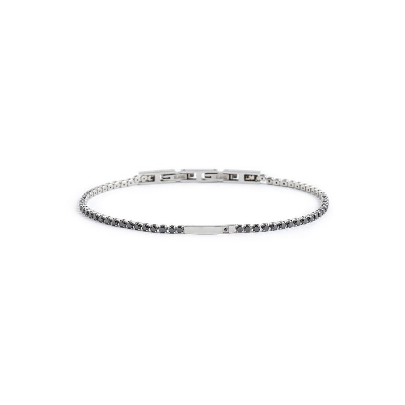 Descrizione: bracciale con catena tennis in acciaio con cubic zirconia di diametro 2 mm. Al centro una placca in acciaio con cubic zirconia sul lato.