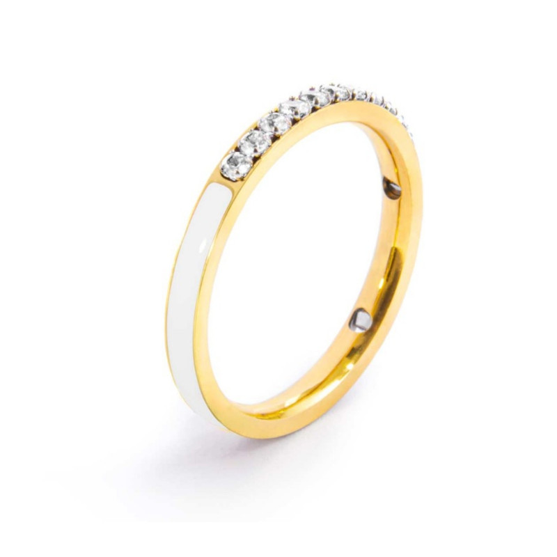 Descrizione: anello fedina in acciaio anallergico con cubic zirconia fi 1,70 mm e smalto. Nella parte interna laserati il logo Marlù e la taglia.