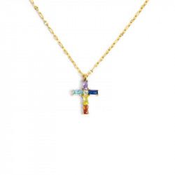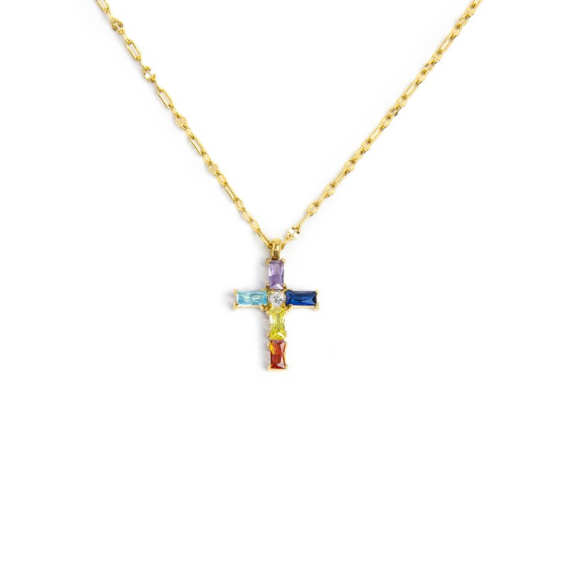 Descrizione: collana in acciaio con croce pendente 1,4 x 2,3 cm con cristalli baguette e al centro un cubic zirconia bianco. Marlù logo laserato sul lato della croce.