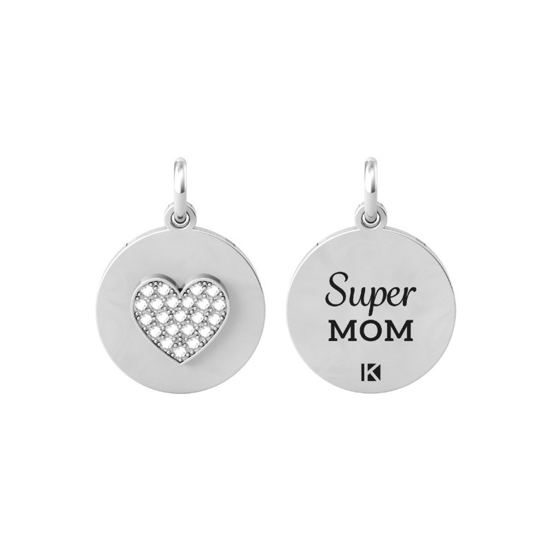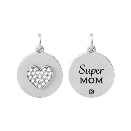 Descrizione: charm tondo in acciaio anallergico con simbolo cuore in pavè - scritta retro smaltata: Super MOM