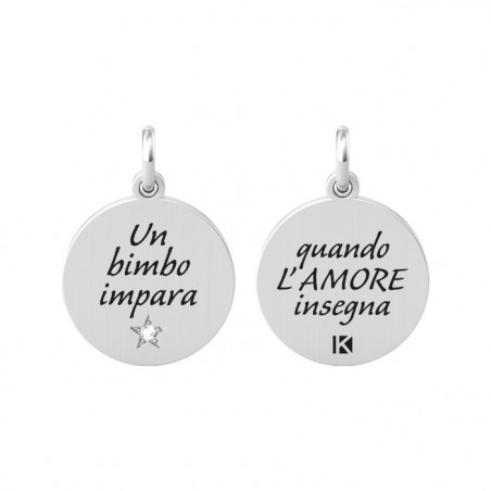 Descrizione: charm tondo in acciaio anallergico e cristallo - scritta smaltata: Un bimbo impara quando L'AMORE insegna