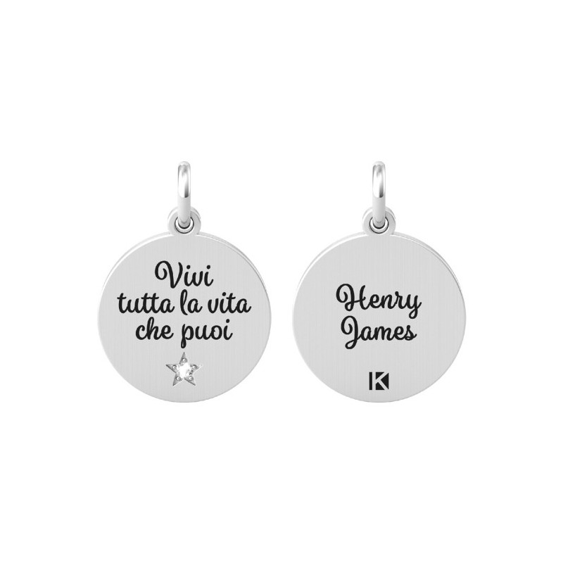 Descrizione: charm tondo in acciaio anallergico e cristallo - scritta smaltata: Vivi tutta la vita che puoi - Henry James