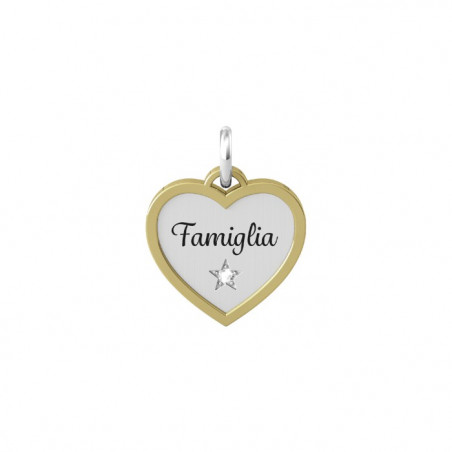Descrizione: charm taglio cuore con scritta smaltata Famiglia in acciaio anallergico e cristallo