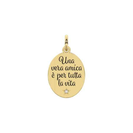 Descrizione: charm ovale in acciaio anallergico e cristallo con scritta smaltata: Una vera amica è per tutta la vita
