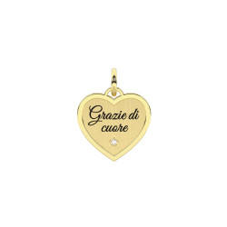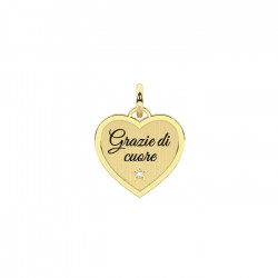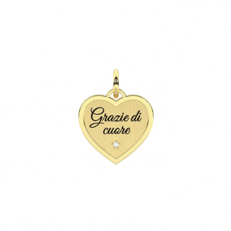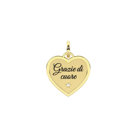 Descrizione: charm taglio cuore in acciaio anallergico e cristallo con scritta smaltata: Grazie di cuore
