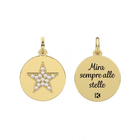 Descrizione: charm tondo in acciaio anallergico con simbolo stella in pavè di cristalli in rilievo e scritta smaltata nel retro: Mira sempre alle stelle