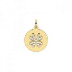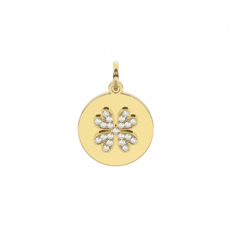 Descrizione: charm tondo in acciaio anallergico con simbolo quadrifoglio in pavè di cristalli in rilievo