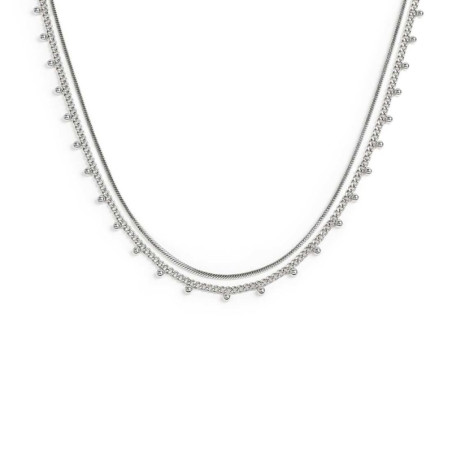 Descrizione: con un cenno allo stile anni '70, Marlù presenta la linea Vision, una collezione nata per essere mixata. Immergiti nel mondo Boho Chic di Marlù con il collier doppio in acciaio 316L anallergico con catena snake quadrata larga 1,10 mm e catena grumetta e sfere