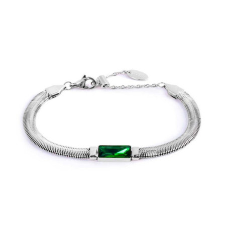 Descrizione: equilibrato, vivido, sofisticato, questo autunno il verde smeraldo è il protagonista assoluto della collezione Marlù "Dress Green Feel Chic". E il colore si antropomorfizza, si fa animale sinuoso, diventa #serpente. Bracciale catena snake in acciaio con al centro cristallo nanometer verde 6 x 12 mm taglio baguette. Chiusura con moschettone. Marlù logo tag ovale presente all' estremità.