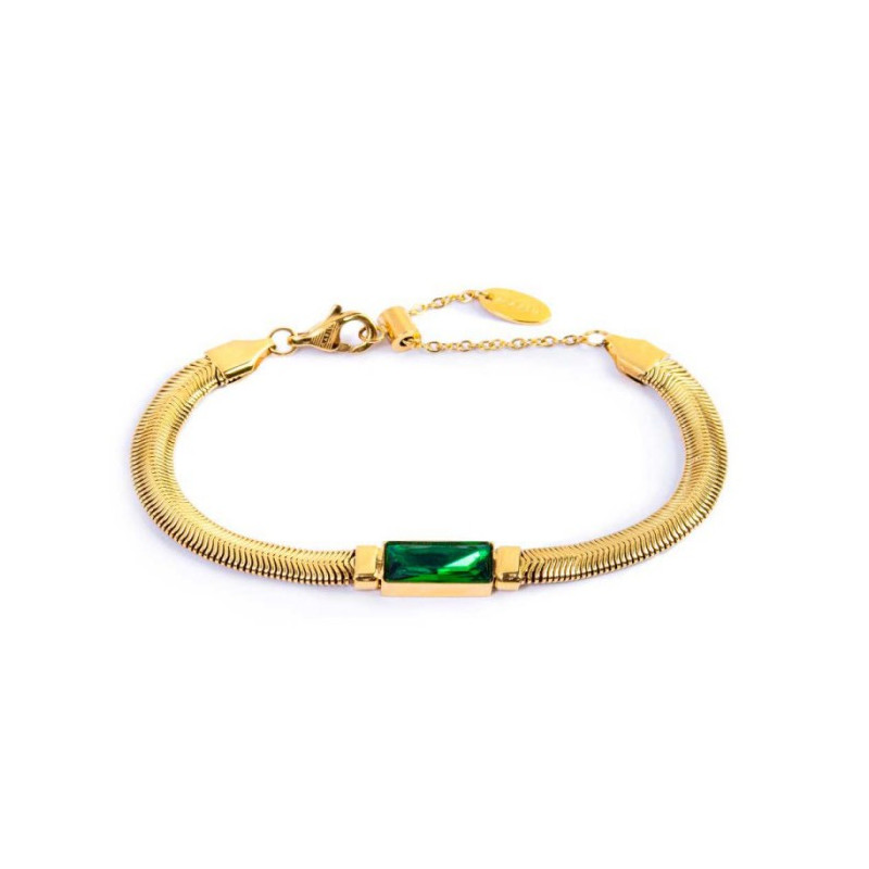 Descrizione: equilibrato, vivido, sofisticato, questo autunno il verde smeraldo è il protagonista assoluto della collezione Marlù "Dress Green Feel Chic". E il colore si antropomorfizza, si fa animale sinuoso, diventa #serpente. Bracciale catena snake in acciaio con al centro cristallo nanometer verde 6 x 12 mm taglio baguette. Chiusura con moschettone. Marlù logo tag ovale presente all' estremità.