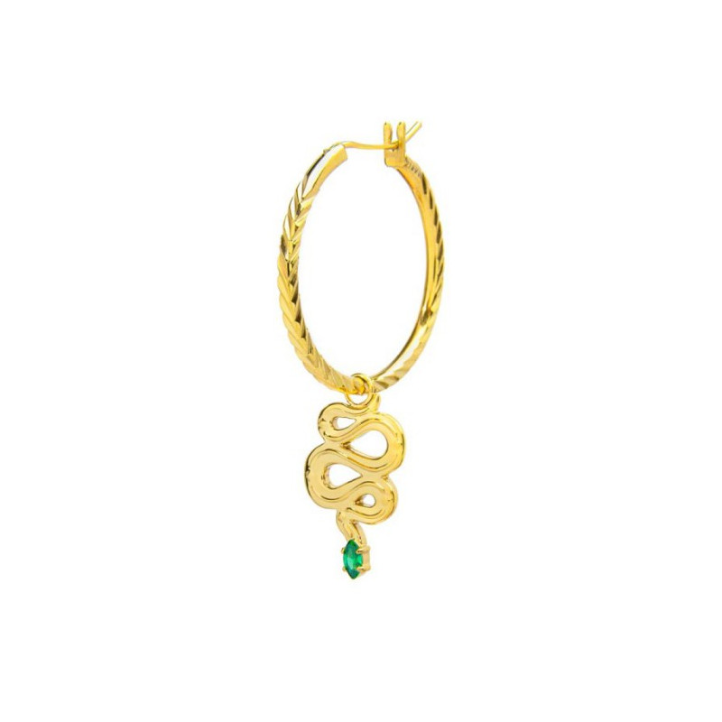 Descrizione: orecchino mono a cerchio con texture, pendente a forma di serpente, cubic zirconia verde taglio marquise e trama in rilievo in acciaio anallergico