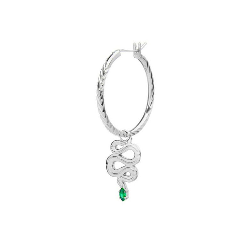Descrizione: orecchino mono a cerchio con texture, pendente a forma di serpente, cubic zirconia verde taglio marquise e trama in rilievo in acciaio anallergico