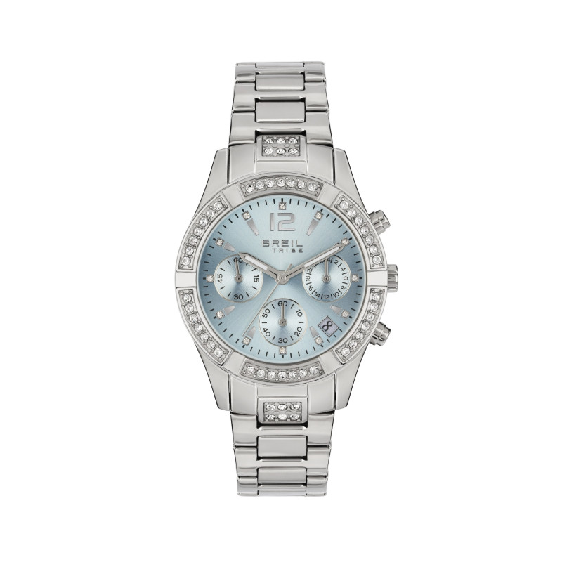 Descrizione: cronografo femminile dal look glamour e seducente. Cristalli sfavillanti sulla lunetta e agli indici, quadrante microbillet abbinato alla cassa in acciaio lucido, come il bracciale.