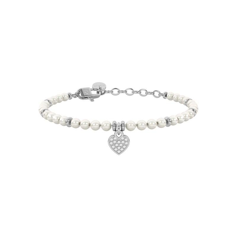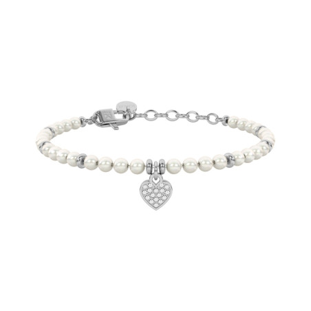 Descrizione: bracciale con perle di conchiglia e ciondolo a forma di cuore in pavè di cristalli bianchi ed acciaio anallergico
