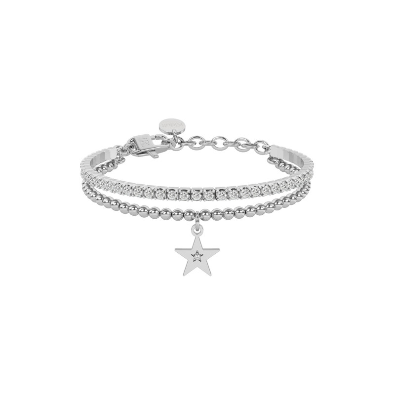Descrizione: bracciale doppio in acciaio anallergico con catena pallinata e catena tennis. Ciondolo a forma di stella pendente e cristallo.