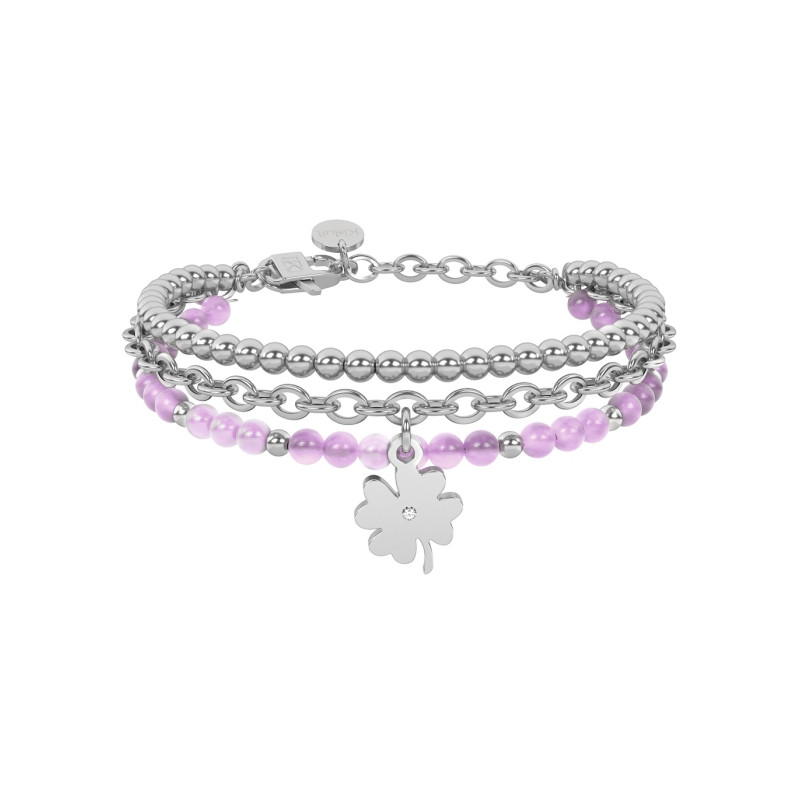 Descrizione: bracciale triplo in acciaio anallergico con catena pallinata, catena maglia rolò e catena con giada rosa. Ciondolo a forma di quadrifoglio pendente e cristallo.