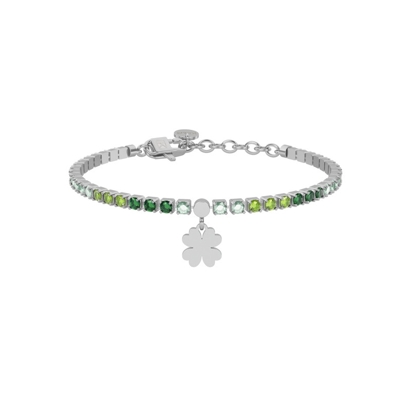 Descrizione: bracciale in acciaio anallergico con catena tennis e ciondolo a forma di quadrifoglio pendente.