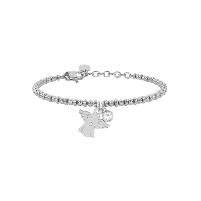 Descrizione: bracciale in acciaio anallergico catena pallinata con ciondolo a forma di angelo e cristallo pendenti.