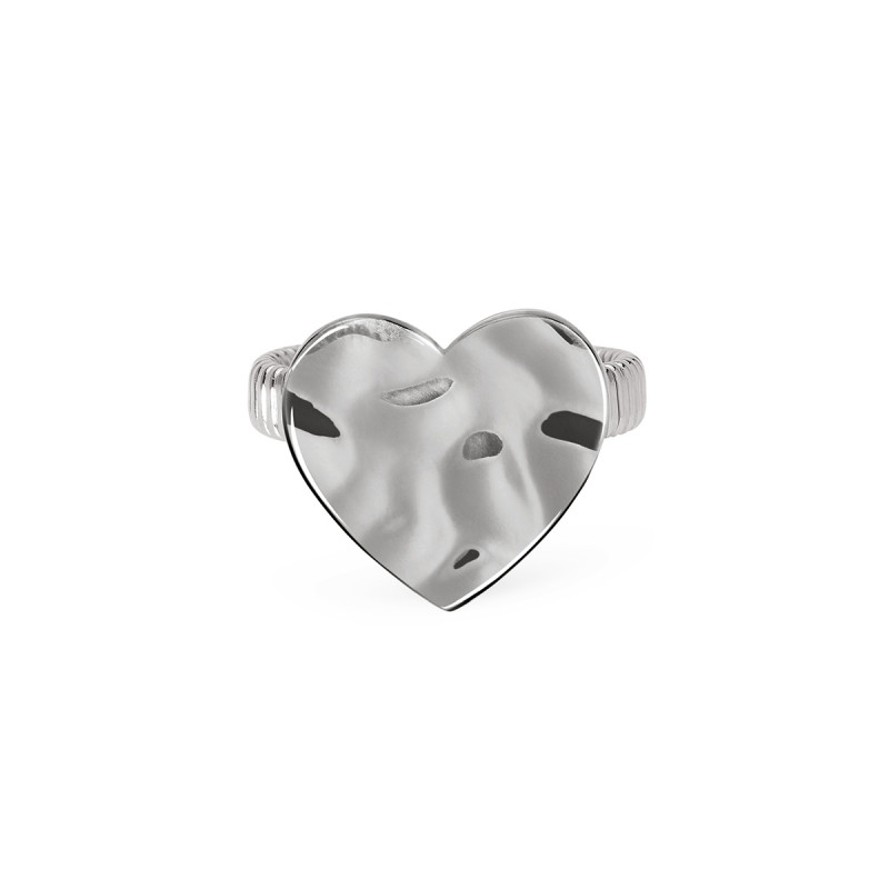Descrizione: Anello aperto in acciaio 304 e 316L, misura regolabile da tg 11 a tg 19, con maglia tubogas 4x2mm e cuore martellato 17x16 mm.