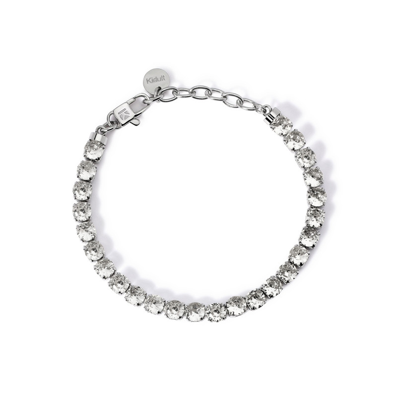 Descrizione: Bracciale tennis in acciaio 316L, lunghezza regolabile da 16 a 19.5 cm, con cristalli fi 5 mm.