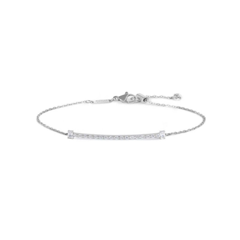 Descrizione: Bracciale acciaio, catena cutting cross, cubic zirconia bianchi tondi e a taglio baguette. Lunghezza tot. 19 cm regolabile