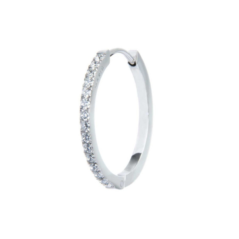 Descrizione: mono orecchino acciaio, cerchio fi 2,4 cm, cubic zirconia fi 1,70 mm. Chiusura a pressione. Sul lato logo Marlù laserato.