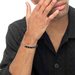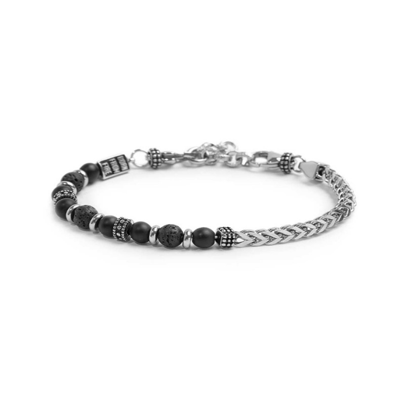 Descrizione: Bracciale acciaio, catena a spina di pesce, onice nera opaca, pietra lavica, black oil. Estensione con catena rolò removile/regolabile. Lunghezza tot. 22,8 cm regolabile da 22,8 a 19 cm