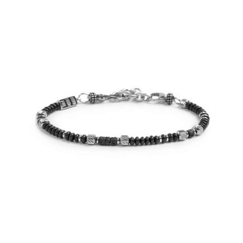 Descrizione: Bracciale acciaio, onice nera, pietra lavica, black oil. Estensione con catena rolò removile/regolabile. Lunghezza tot. 22,8 cm regolabile da 22,8 a 19 cm