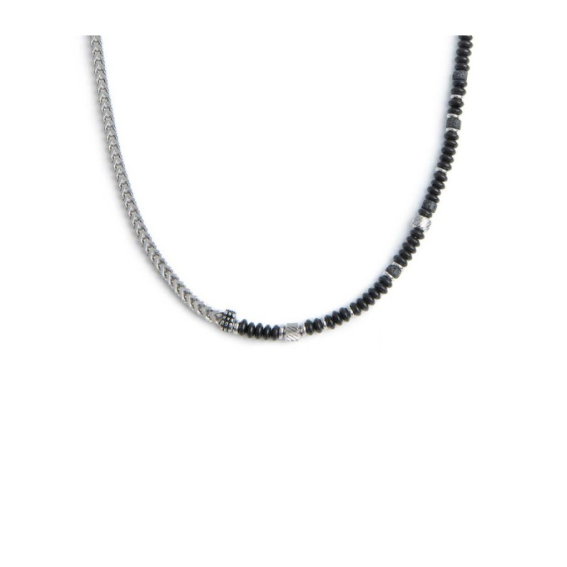 Descrizione: Collana acciaio, catena a spina di pesce, onice nera, pietra lavica, black oil opaco. Lunghezza tot. 60 cm regolabile da 60 a 50 cm tramite estensione con catena rolò