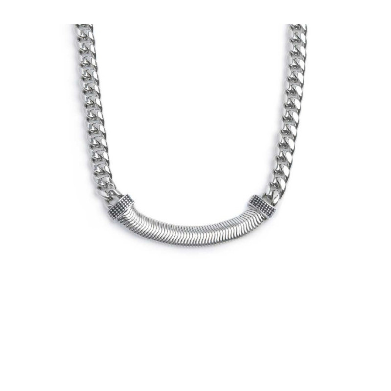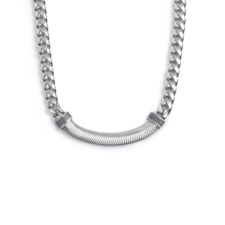 Descrizione: Collana acciaio, catena cuban sp. 8 mm, catena snake piatta, black oil. Lunghezza tot. 55,5 cm regolabile da 55,5 a 50 cm tramite catena cuban removibile