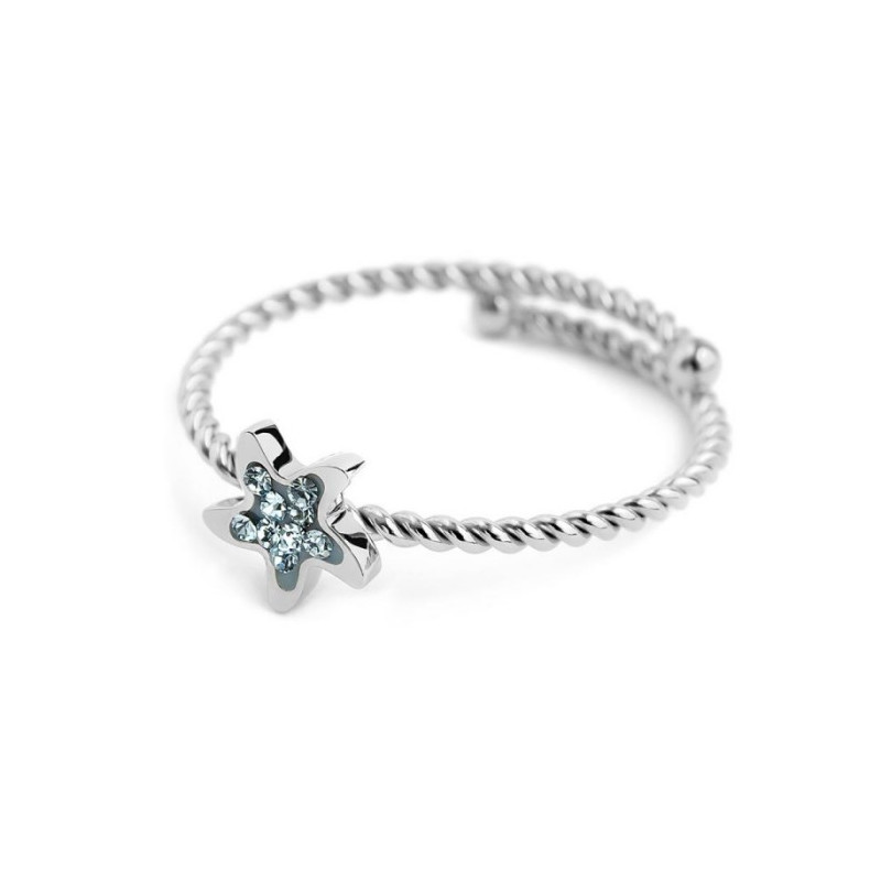 Descrizione: Anello in acciaio, ritorto, regolabile. Materiali: acciaio, cristalli