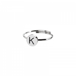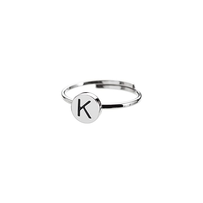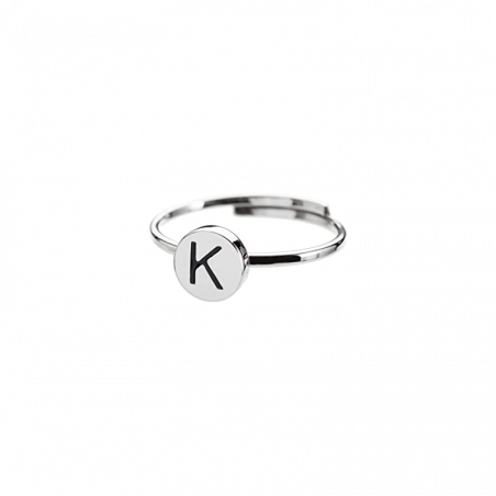 Descrizione: Anello regolabile in acciaio con lettera smaltata. Materiale: acciaio, smalto