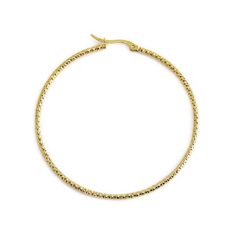 Descrizione: Orecchino mono cerchio martellato con diametro 6 cm e spessore 0,19 cm. Logo Marlù laserato sulla parte posteriore della chiusura. Materiali: acciaio, pvd.