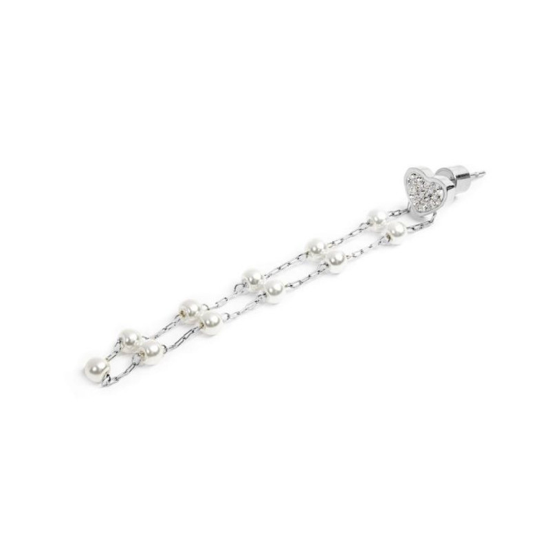Descrizione: Mono orecchino con cuore con cristalli bianchi e con catena pendente con perle. Lunghezza totale 6.5 cm. Material: acciaio, pvd.