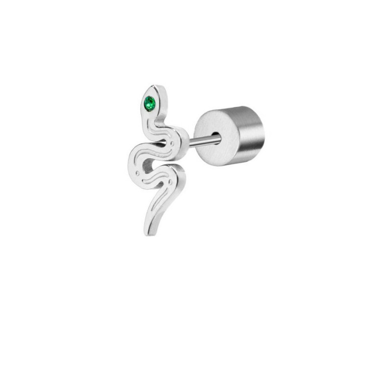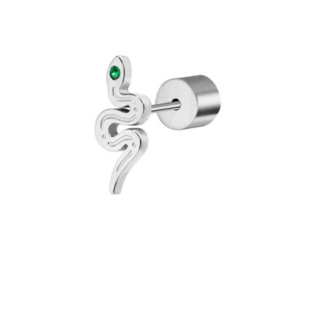 Descrizione: Mono orecchino acciaio a lobo a forma di serpente con cristallo verde e trama incisa.