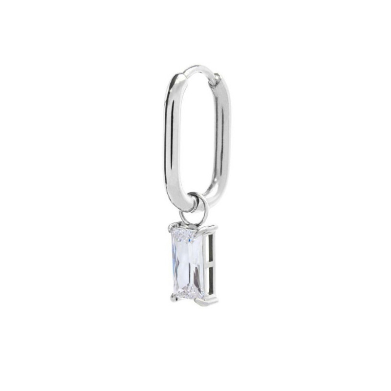 Descrizione: Mono orecchino acciaio ovale 1,6*1,1 cm con chiusura a pressione, con cubic zirconia taglio baguette pendente. Logo Marlù laserato sul fianco dell'orecchino e sul fondo del pendente. Lunghezza totale 2,6 cm.