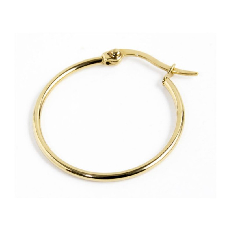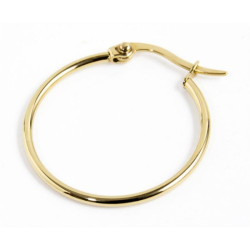 Descrizione: Mono orecchino cerchio con diametro esterno 25 mm, con spessore 1.50 mm, chiusura a scatto. Logo Marlù laserato sul lato. Materiale: acciaio, pvd
