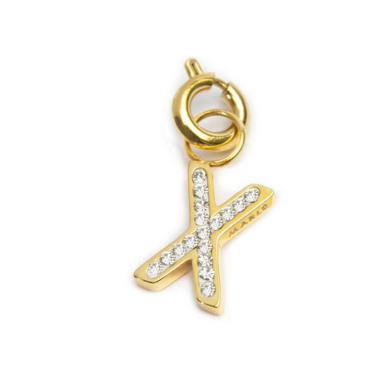 Descrizione: Charm lettera sagomata con cristalli bianchi. Sul retro texture con puntini in rilievo.  Logo Marlù laserato su un lato. Materiale: acciaio