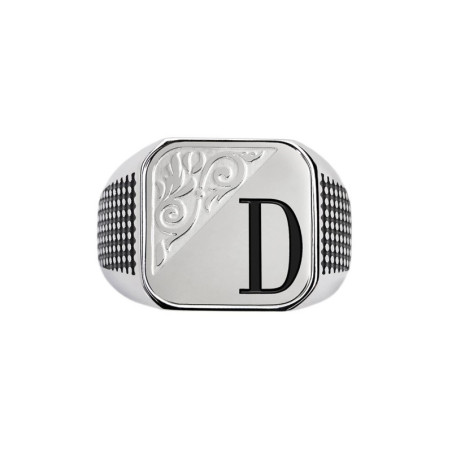 Descrizione: Piastrina quadrata per anello, sulla parte frontale un'incisione con texture e lettere in black oil. Sul retro logo Marlù inciso. Materiale: acciaio