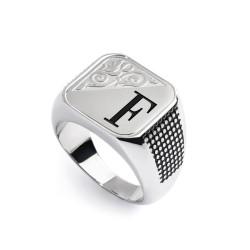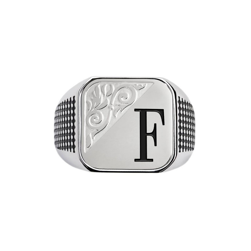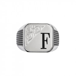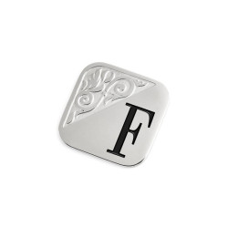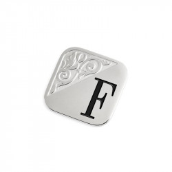 Descrizione: Piastrina quadrata per anello, sulla parte frontale un'incisione con texture e lettere in black oil. Sul retro logo Marlù inciso. Materiale: acciaio