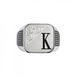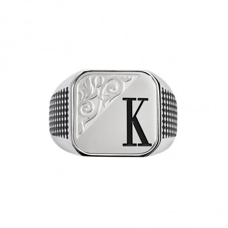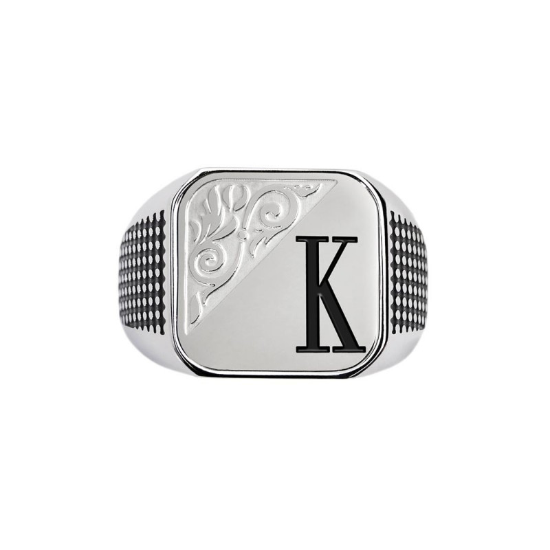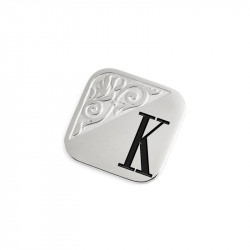 Descrizione: Piastrina quadrata per anello, sulla parte frontale un'incisione con texture e lettere in black oil. Sul retro logo Marlù inciso. Materiale: acciaio