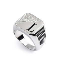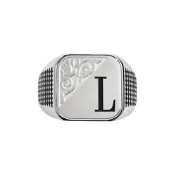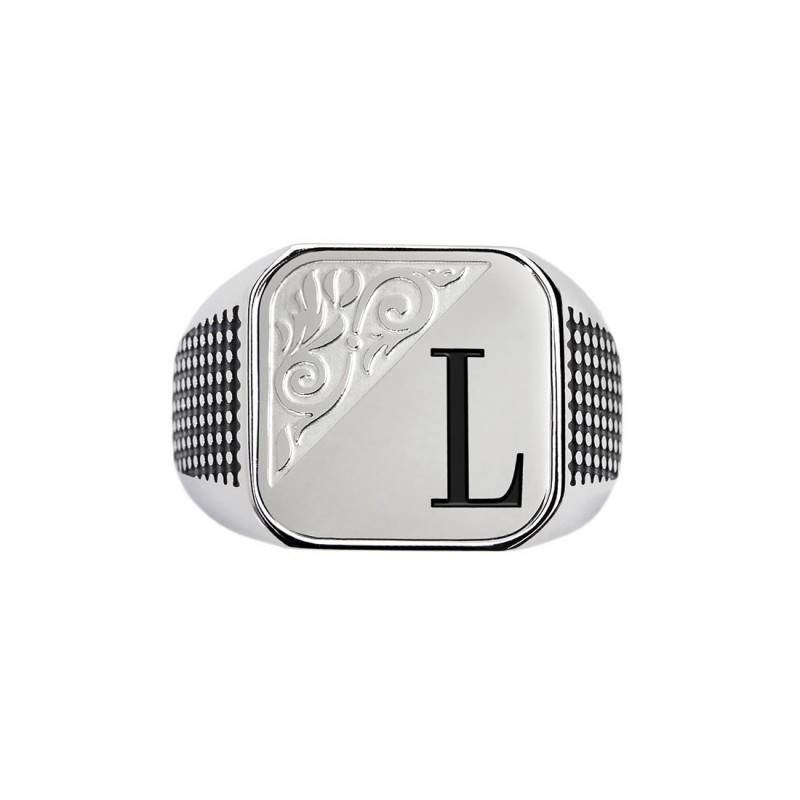 Descrizione: Piastrina quadrata per anello, sulla parte frontale un'incisione con texture e lettere in black oil. Sul retro logo Marlù inciso. Materiale: acciaio