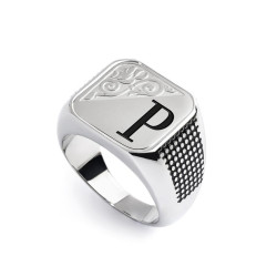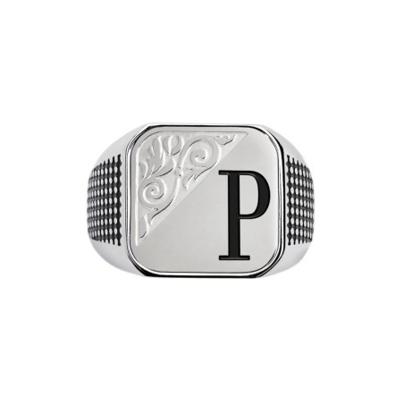 Descrizione: Piastrina quadrata per anello, sulla parte frontale un'incisione con texture e lettere in black oil. Sul retro logo Marlù inciso. Materiale: acciaio