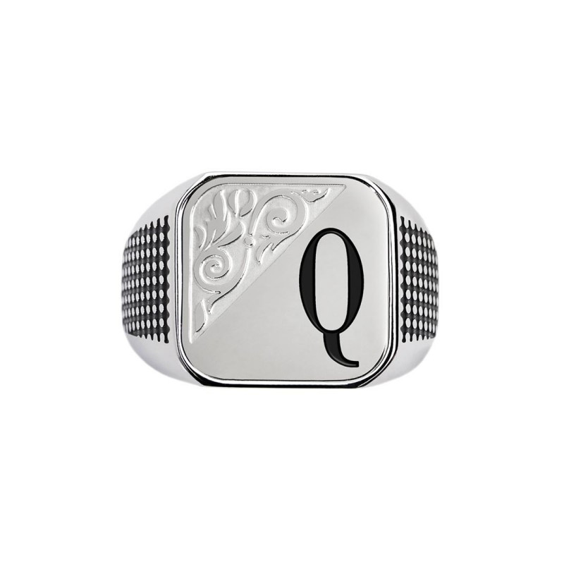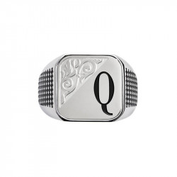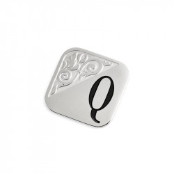 Descrizione: Piastrina quadrata per anello, sulla parte frontale un'incisione con texture e lettere in black oil. Sul retro logo Marlù inciso. Materiale: acciaio