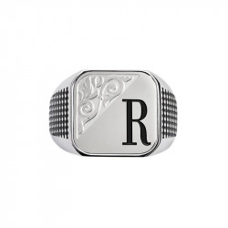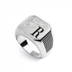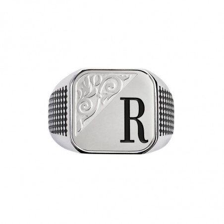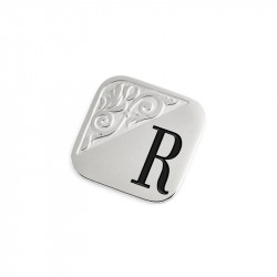 Descrizione: Piastrina quadrata per anello, sulla parte frontale un'incisione con texture e lettere in black oil. Sul retro logo Marlù inciso. Materiale: acciaio